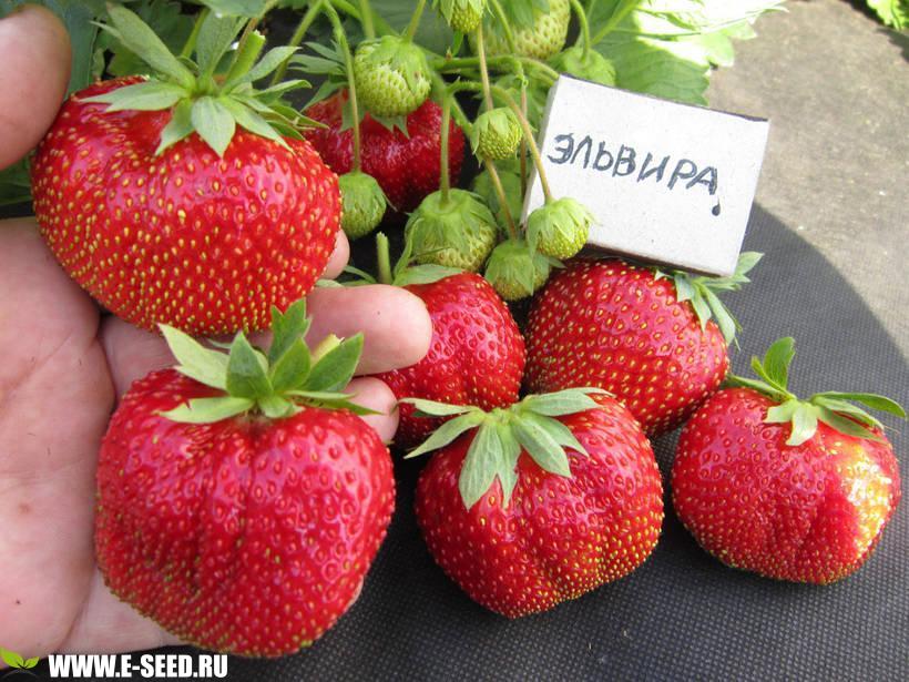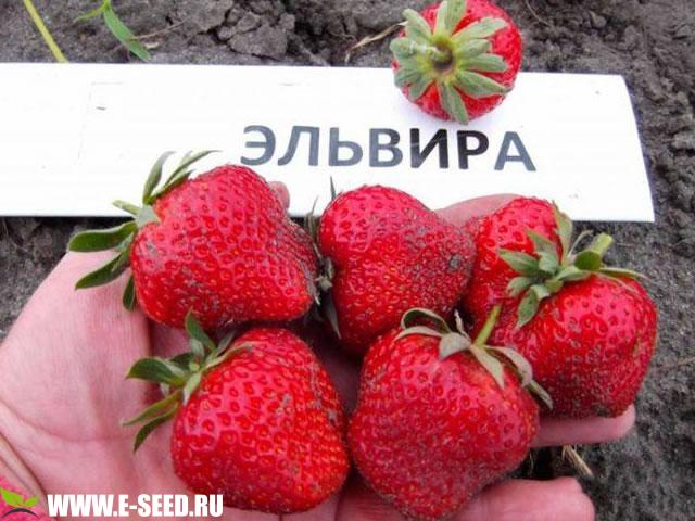 Среди садоводов, занимающихся культивированием клубники, особо ценятся сорта раннего срока плодоношения, которые выдают стабильный урожай, независимо от погодных условий. Голландская клубника Эльвира отвечает всем представленным качествам. Ягоды округлой формы, с глянцевой кожицей. При созревании насыщенно-красные. Средняя масса 30 г., первая волна часто радует плодами весом 50-60 г. Клубника вкусная, очень сладкая. Кислинки нет, несмотря на то, что в составе ягодки 35% аскорбинки. Мякоть плотная, сочная, красная, без пустот. В период плодоношения вокруг кустиков витает густой земляничный аромат. Диаметр шейки корня : А++ 17 мм и более