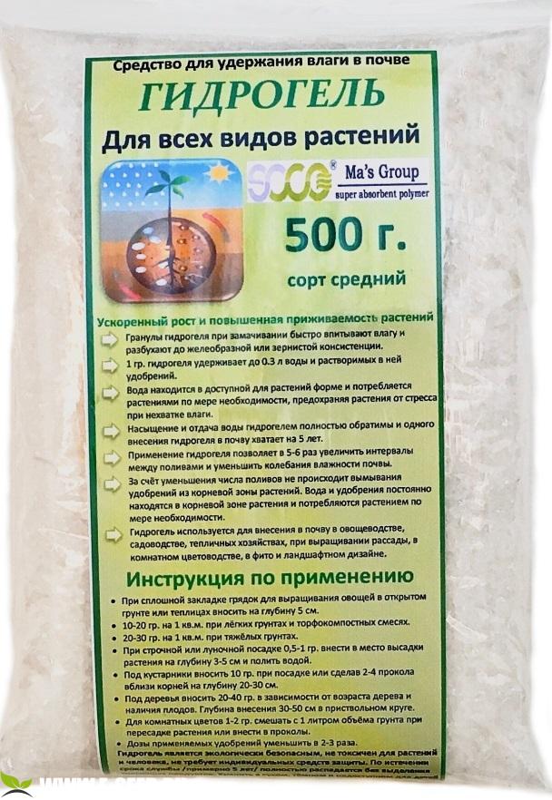 Представляет собой сухие гранулы. При замачивании водой гранулы разбухают и аккумулируют воду в форме, доступной для корневой системы растений. Работает в почве не менее 5 лет. Гранулы гидрогеля при замачивании быстро впитывают влагу и разбухают до желеобразной или зернистой консистенции. 1 гр. гидрогеля удерживает до 0.3 л воды и растворимых в ней удобрений. Вода находится в доступной для растений форме и потребляется растениями по мере необходимости, предохраняя растения от стресса при нехватке влаги. Насыщение и отдача воды гидрогелем полностью обратимы и одного внесения гидрогеля в почву хватает на 5 лет. Применение гидрогеля позволяет в 5-6 раз увеличить интервалы между поливами и уменьшить колебания влажности почвы. За счёт уменьшения числа поливов не происходит вымывания удобрений из корневой зоны растений. Вода и удобрения постоянно находятся в корневой зоне растения и потребляются растением по мере необходимости. Гидрогель используется для внесения в почву в овощеводстве, садоводстве, тепличных хозяйствах, при выращивании рассады, в комнатном цветоводстве, в фито и ландшафтном дизайне. Используется при сплошной закладке грядок для выращивания овощей в открытом грунте или теплицах (на глубину 5 см)