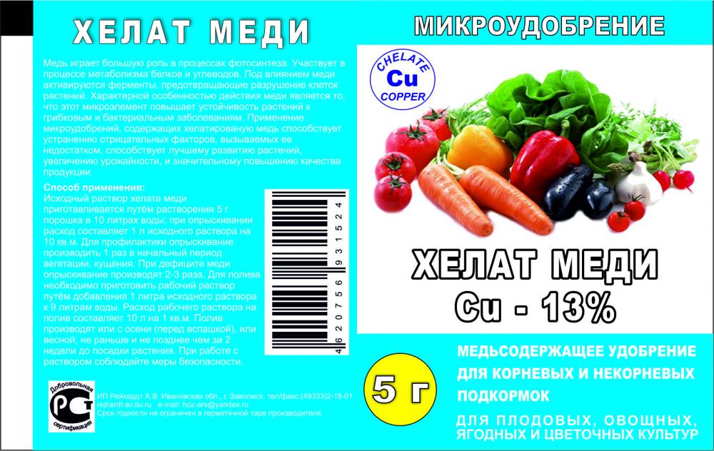 Применение: исходный раствор хелата меди приготавливается путем растворения 5гр порошка в 10л воды,