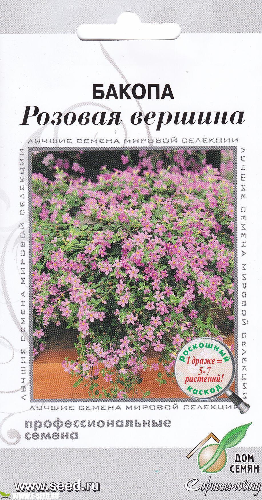 Многолетнее, обильноцветущее, ампельное растение (чаще выращивается как однолетнее). Бакопа отличается практически непрерывным волнообразным цветением в течении очень длительного времени. Высота 15 см и ширина до 30-35 см. Некрупные цветки очень устойчивы к непогоде, не теряют красоты даже при затяжных дождях. Замечательное свойство - это способность к самоочищению от увядших цветков. Выращивают бакопу в подвесных корзинах или декоративных горшках. Посев: семян на рассаду в марте - начале апреля. Семена заключены в мультидраже. Одно мультидраже содержит 5-7 семян. Пикировку проводят в подвесные кашпо, не отделяя растения друг от друга. Всходы появляются через две недели при t=+20ºС. Рассаду высаживают в открытый грунт после окончания последних весенних заморозков. Расстояние между растениями 20-30 см.