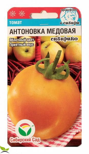 Растение полуштамбовое, крепкое, высотой до 1,1м., требует подвязки. Первая кисть формируется рано, над 5 листом, последующие через два листа. Плоды округлые, массой до 200г, в биологической спелости приобретают медовую окраску, без пятна у плодоножки. Мякоть малосемянная, светлая с желтыми и розовыми прожилками. Плотные не растрескивающиеся томаты отменно подходят для консервации, красиво смотрятся в банках. Оригинальный вкус и отличная лежкость плодов позволяют наслаждаться свежими салатами из «Антоновки медовой» до зимних морозов.