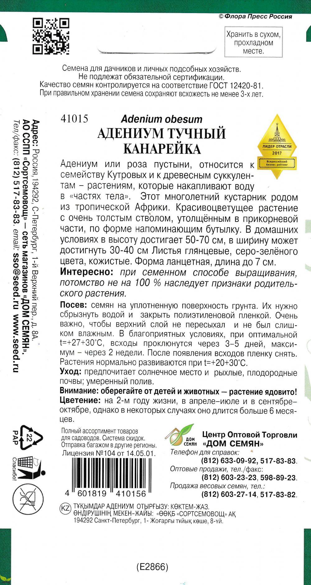 Адениум или роза пустыни, относится к семейству Кутровых и к древесным суккулентам - растениям, которые накапливают воду в «частях тела». Этот многолетний кустарник родом из тропической Африки. Красивоцветущее растение с очень толстым стволом, утолщённым в прикорневой части, по форме напоминающим бутылку. В домашних условиях в высоту достигает 50-70 см, в ширину может достигнуть 30-40 см Листья глянцевые, серо-зелёного цвета, кожистые. Форма ланцетная, длина до 7 см. Интересно: при семенном способе выращивания, потомство не на 100 % наследует признаки родительского растения.