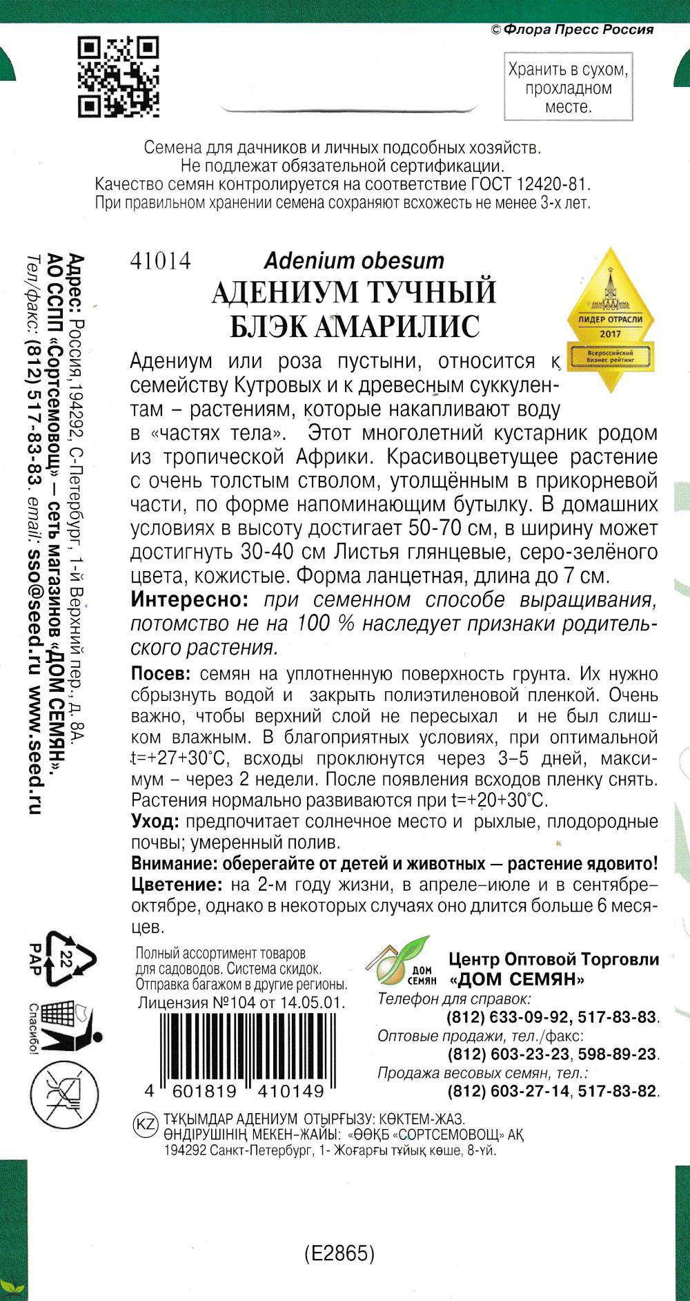 Адениум или роза пустыни, относится к семейству Кутровых и к древесным суккулентам - растениям, которые накапливают воду в «частях тела». Этот многолетний кустарник родом из тропической Африки. Красивоцветущее растение с очень толстым стволом, утолщённым в прикорневой части, по форме напоминающим бутылку. В домашних условиях в высоту достигает 50-70 см, в ширину может достигнуть 30-40 см Листья глянцевые, серо-зелёного цвета, кожистые. Форма ланцетная, длина до 7 см. Интересно: при семенном способе выращивания, потомство не на 100 % наследует признаки родительского растения.