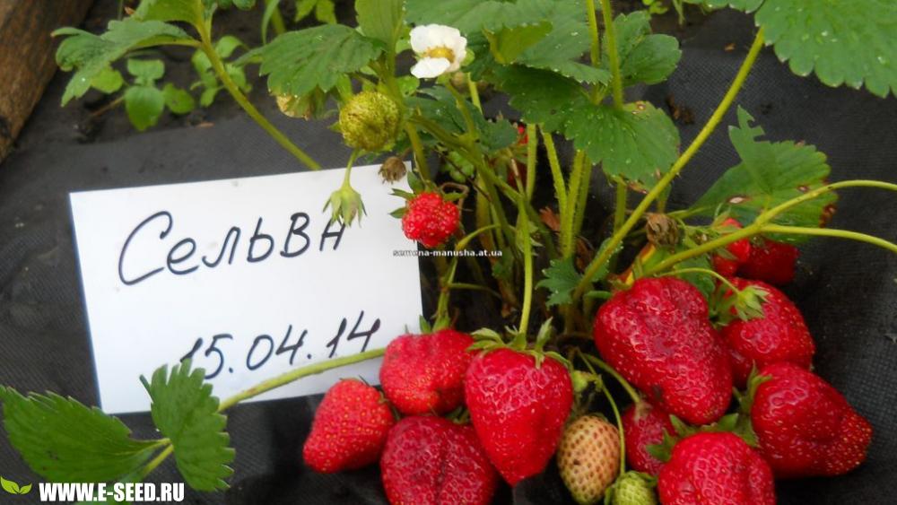 Ранний ремонтантный сорт. Яркие привлекательные ягоды длительного хранения, ягода весом 20-60 грамм. Сладкие с небольшой кислинкой, с ароматом напоминающим лесную землянику,мякоть плотная. Куст земляники Сельва - очень декоративен и превосходит в этом другие сорта. Благодаря повышенному образованию усов, куст можно использовать как вьющийся, укрепляя его на шпалере. В течение всего сезона растение тянется вверх. Из молодых кустиков вырастают лианы покрытые белыми цветами и ягодами. Диаметр шейки : 8-15 мм